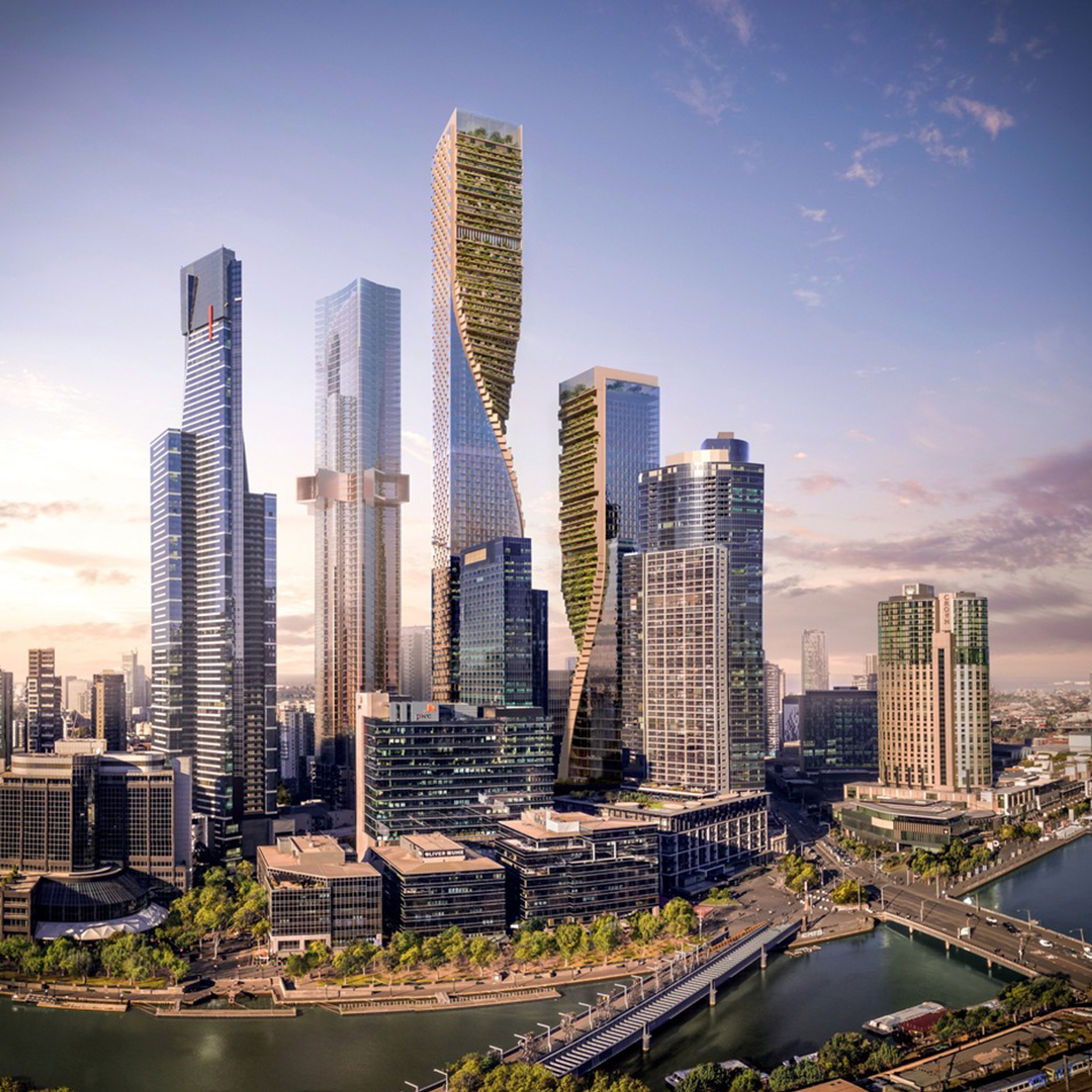 O Green Spine foi projetado como uma edificação de uso misto de ponta, centrado na inovação em arquitetura e design, buscando a revitalização do Distrito de Southbank, em Melbourne. A visão dos escritórios UNStudio e Cox Arquitecture incluíam o aproveitamento dos 6.000 metros quadrados do terreno, com duas torres de geometrias torcidas com fachadas de vidro e terraços verdes, mesclando o design verde para as funções comerciais, hoteleiras, residenciais, culturais e públicas desenvolvidas por especialistas em propriedades e negócios, em conjunto com o grupo Beulah International. Sendo reconhecido como o maior arranha-céu da Austrália. Incrível, não?